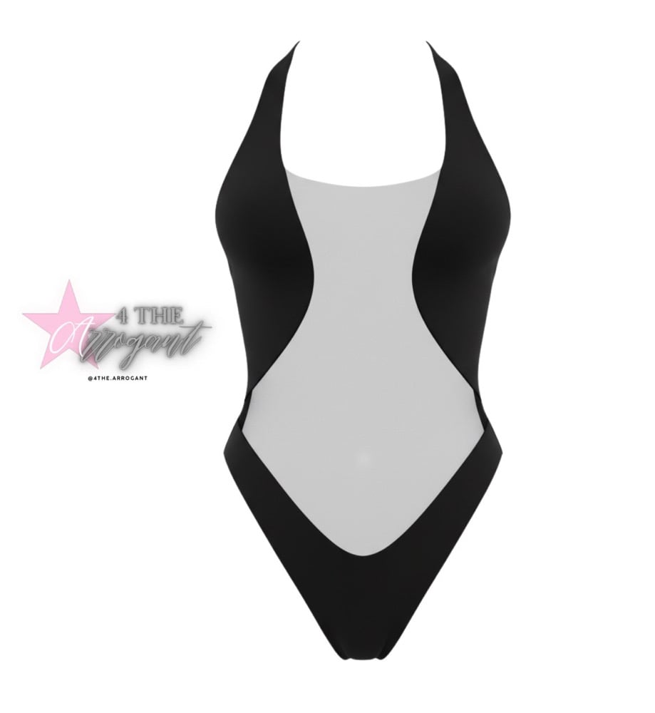 Black tie up body suit with mesh in the middle .