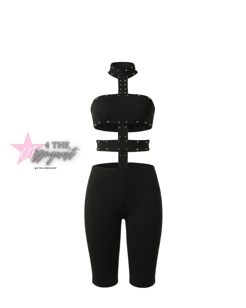 Black bodysuit with cut offs and spike detailing . Super Stretchy